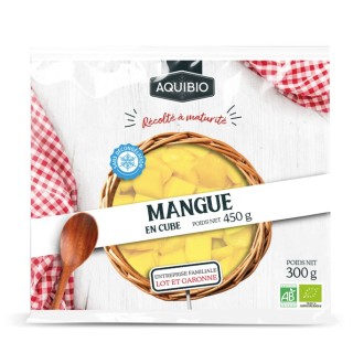 Morceaux de mangue surgelés et conditionnés dans un sachet. "Le produit répond aux standards et aux exigences de la Législation Européenne...